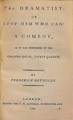 The Dramatist: Or, Stop Him who Can! is a 1789 comedy play by the British writer Frederick Reynolds. It premiered at the Theatre Royal, Covent Garden on 15 May 1789.[1] [2] The original cast included John Quick as Lord Scratch, Joseph George Holman as Harry Neville, William Blanchard as Floriville, William Macready as Willoughby, Joseph Shepherd Munden as Ennui, James Thompson as Peter, William Thomas Lewis as Vapid, Ann Brunton as Louisa Courtney, Lydia Webb as Lady Waitfor't and Mary Wells as Marianne.
