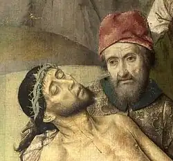 The Pharisee Nicodemus supports Christ as he is lowered, and can be identified by his similarity to Simon the Pharisee in another canvas attributed to Bouts, Christ in the House of Simon.[12] The Virgin wears a white headdress and a dark blue dress with a yellowish mantle, and holds Christ's arm just above his wrist as if afraid to let go of her dead son. She is supported by John the Evangelist, who wears a red robe. Dressed in green robes, Mary Salome stands to the Virgin's left, wiping tears from her face with the fold of her white headdress. Mary of Clopas is behind them, holding a red cloth over her mouth, while the Magdalen is in the foreground at Christ's feet, dressed in a heavily folded cloak. The man in the brown–green tabard at the feet of Christ is probably Joseph of Arimathea, who, according to the four canonical Gospels, brought Christ's body to Golgotha from Pontius Pilate.[12]