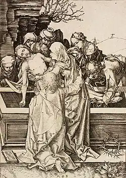 The example and renown of 15th-century Netherlandish painting spread across Europe by late in the century, and many copies or designs based on the work of the Netherlandish masters were produced.[38] Likely following the compositional example of Rogier van der Weyden, the London canvas is the only surviving example of a work on the subject by Bouts.[39] The influence of Bouts's Entombment can be seen, in turn, in the German artist Martin Schongauer's c. 1480 engraving of the same name, which shares compositional similarity and echoes Bouts's use of painted emotive gesture, posture, and expression.[40]