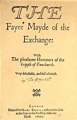 - The Fayre Mayde of the Exchange: with the pleasant humours of the Cripple of Fanchurch. Very delectable and full of mirth. (printed in 1607 by Valentine Simmes[2])