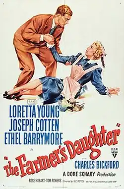 The Farmer's Daughter is a 1947 American comedy film directed by H.C. Potter that tells the story of a farmgirl who ends up working as a maid for a Congressman and his politically powerful mother. It stars Loretta Young, Joseph Cotten, Ethel Barrymore, and Charles Bickford, and was adapted by Allen Rivkin and Laura Kerr from the 1937 Finnish play Juurakon Hulda  by Hella Wuolijoki, using the pen name Juhani Tervapää (misspelled in the film's credits as Juhni Tervataa).