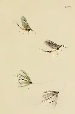 The Fly-fisher's Entomology is the archetype fly-fishing how-to book. Most fly-fishing historians credit Ronalds with setting a literature standard in 1836 that is still followed today.[1] Describing methods, techniques and, most importantly, artificial flies, in a meaningful way for the angler and illustrating them in colour is a method of presentation that can be seen in most fly-fishing literature today. As the name implies, this book is mostly about the aquatic insects—mayflies, caddisflies and stoneflies—that trout and grayling feed on and their counterpart artificial imitations. Less than half the book (chapters I–III) is devoted to observations of trout, their behaviour, and the methods and techniques used to catch them. Most of this information, although enhanced by Ronalds' experiences and observations, was merely an enhancement of Charles Bowlker's Art of Angling (first published in 1774 but still in print in 1836).[2]
