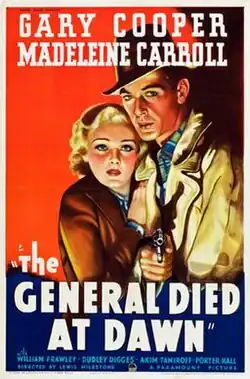 The General Died at Dawn is a 1936 American drama film that tells the story of a mercenary who meets a beautiful girl while trying to keep arms from getting to a vicious warlord in war-torn China. The movie was written by Charles G. Booth and Clifford Odets and directed by Lewis Milestone.[1]