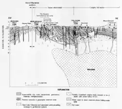 Steam used at The Geysers is produced from a greywacke sandstone reservoir, capped by a heterogeneous mix of low permeability rocks and underlain by a silicic intrusion.[8][16] Gravitational and seismic studies suggest that the source of heat for the steam reservoir is a large magma chamber over 4 miles (6.4 km) beneath the surface, and greater than 8 miles (13 km) in diameter.[17]