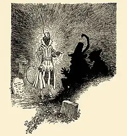 On the third and final night, a passing battle-scarred and retired soldier pauses to rest by the churchyard and says he will sit with the poor man and join him in watching over the grave. At midnight, the two are disturbed by a shrill whistling, which heralds the arrival of the Devil, who has come to claim the rich man's soul. The two defy him, so after threatening them, the devil tries a subtler ruse and bribes the men with an offer of gold into giving up their watch. The soldier says that if the devil fills his boot with gold, they will leave. The Devil departs to fetch the gold, and in his absence, the soldier takes off his boot and cuts a large hole in the sole.[3][4][5]