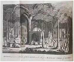 The Great Banyan is a banyan tree (Ficus benghalensis) located in Acharya Jagadish Chandra Bose Indian Botanic Garden, Shibpur, Howrah, near Kolkata, India.[1] The great banyan tree draws more visitors to the garden than its collection of exotic plants from five continents. Its main trunk became infected by fungi after it was struck by two cyclones. In 1925, the main trunk was removed to keep the remainder of the tree healthy. A 330-metre-long (1,080 ft) road was built around its circumference, but the tree continues to spread beyond it.