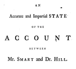 Included in the work is "An Accurate and Impartial STATE of the ACCOUNT Between Mr. Smart and Dr. Hill."[16] The "account" includes 12 essays, six by Hill that claims Smart as his "debtor" for various "praises" and six that are "per contra creditor" over "his abuse".[17] Although the "account" compiles all of the essays together, the original essay written by Hill was published 9 March 1751 and was not followed until 13 August 1752.[17] At one point, John Newbery actually included a publisher's note to directly attack Hill's claims that he helped establish Smart by introducing the young poet to Newbery.[18] The reason for adding the twelve "accounts" becomes clear when the editor ads the essays together and claim that The Hilliad is "Due on the Balance to the INSPECTOR."[19] Although the "accounts" are satirically laid out, according to Lance Bertelsen, they represent "precisely the exchange of praise and abuse, and the notoriety established by such exchanges, that generated sales that put shillings in capricious hungry authors' pockets."[20]