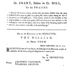 During this conflict, Smart tried to publish his first collection, and the 851 people subscribers to Smart's Poems could not keep it from coming under attack.[2] In the August 1752 Monthly Review, Hill derided the Poems and singled out The Hop-Garden for a particularly harsh review.[8] Combined with other attacks, Hill began to provoke Smart into a literary conflict.[9] On 11 November 1752, Smart announced his production of The Hilliad in the Gray's-Inn Journal.[10]