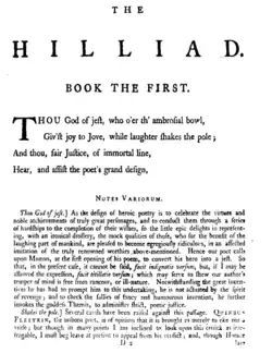 The Hilliad is prefaced by a letter from Smart and a reply possibly written by Murphy.[14] Both seek to draw connections between The Hilliad and the works of Alexander Pope and Fielding that criticize the "corruption" of modern writers.[14] Following these letters is a "Prolegomena to the Hilliad" that claims to be an "extract from a paper called the Impertinent. Published Aug. 13, 1752. Written by Dr. Hill."[15] The "extract" included an attack upon Smart.[15] Following this "extract" is another from the August 1752 Gentleman's Magazine page 387 that responds to Hill's piece.[15]