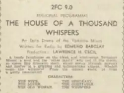 The House of a Thousand Whispers is a 1936 Australian radio play by Edmund Barclay.[1][2]