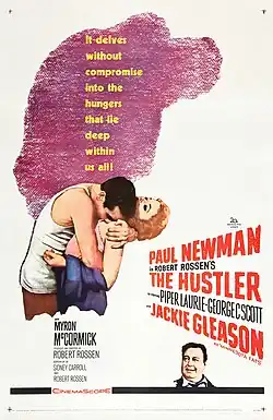 The film was well received by critics, although with the occasional reservation. Variety praised the performances of the entire main cast but felt that the "sordid aspects" of the story prevented the film from achieving the "goal of being pure entertainment".[30] Variety also felt the film was far too long. Stanley Kauffmann, writing for The New Republic, concurred in part with this assessment. Kauffmann strongly praised the principal cast, calling Newman "first-rate" and writing that Scott's was "his most credible performance to date". Laurie, he writes, gives her part "movingly anguished touches" (although he also mildly criticizes her for over-reliance on Method acting). While he found that the script "strains hard to give an air of menace and criminality to the pool hall" and also declares it "full of pseudo-meaning", Kauffmann lauds Rossen's "sure, economical" direction, especially in regard to Gleason who, he says, does not so much act as "[pose] for a number of pictures which are well arranged by Rossen. It is the best use of a manikin by a director since Kazan photographed Burl Ives as Big Daddy."[31] A. H. Weiler of The New York Times, despite finding that the film "strays a bit" and that the romance between Newman and Laurie's characters "seems a mite far-fetched", nonetheless found that The Hustler "speaks powerfully in a universal language that spellbinds and reveals bitter truths".[32]