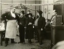 The huge waiter (played by Eric Campbell) glowers at the immigrant (Charlie Chaplin). To his right are Edna Purviance playing another immigrant and Henry Bergman as a bearded artist.