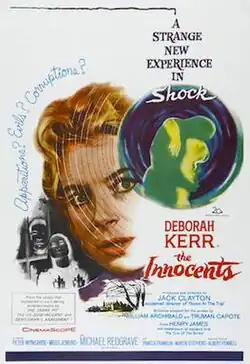 The Innocents is a 1961 gothic psychological horror film directed and produced by Jack Clayton, and starring Deborah Kerr, Michael Redgrave, and Megs Jenkins. Based on the 1898 novella The Turn of the Screw by the American novelist Henry James, the screenplay was adapted by William Archibald and Truman Capote, who used Archibald's own 1950 stage play—also titled The Innocents—as a primary source text. Its plot follows a governess who watches over two children and comes to fear that their large estate is haunted by ghosts and that the children are being possessed.