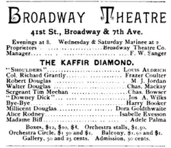 The Kaffir Diamond is an 1888 play. It had its New York City debut at the former Broadway Theatre on September 11, 1888.[1][2][3] Though the audience provided "unbounded applause" on opening night,[4] reviews of the play were negative,[5][6] and it played unsuccessfully for only five weeks, concluding on October 13, 1888.[7][8]