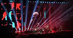 The success of the initial try-outs in New York City led to the group's decision to enter full production rehearsals in October and November 2020,[16] which were planned to take place in Miami, Florida before they relocated to LH2 Studios in west London.[17] Prog magazine received permission to attend a session and photographed the group at work.[18] Patrick Woodroffe, who had worked on the 2007 tour, was rehired as show director. The stage design involves a lighting system, a large video screen, and fog effects to interpret the music.[19][20] As Woodroffe had previously worked with Genesis and befriended the group, he had a clear idea as to what kind of lighting would suit them and knew that they are "musicians first and foremost."[21] At the time of the London rehearsals, Genesis had worked through as many as 24 songs for a proposed two-hour show.[22] A typical daily schedule involved a brief sound check, followed by the group performing the entire set without a break, partly to help Collins strengthen his vocals. Woodroffe and his team observed the production and made notes on any necessary changes to lighting or video cues.[23] The band agreed to have a "very little" amount of live shots of members performing on the screen to place greater emphasis on the visuals.[24] On the final two days of production rehearsals, a 20-person film crew were hired to film Genesis performing the set.[25]