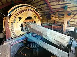 As in many windmills, The Lily features two sets of gears between the sails and the millstones. The first one is between the brake wheel and the wallower which have 63 and 29 teeth respectively. The second gear is formed by the great spur wheel and the stone nut which have 66 and 23 teeth respectively. The number of teeth in each gear has been designed to be coprime to ensure even wear and smooth running of these gears. Both gears together provide a speed increasing gear ratio between sails and millstone of ≈6.2. This means that one complete revolution of the sails causes approximately 6.2 revolutions of the (top) millstone.