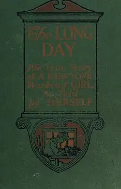 The Long Day: The Story of a New York Working Girl, As Told by Herself is a book about the life of a working-class girl. She was formerly a teacher in a small town, but is now alone in New York City, living day to day on a few dollars. She lives from boarding house to boarding house, experiencing harsh rules, starvation, and the death of a friend. Furthermore, she works in a number of different positions, including box-making, flower/feather making, sewing, and finally, a shaker. Throughout this time, she learns what it is like to live on a few dollars a week, working twelve-hour shifts with horrible conditions and few breaks. Ultimately, she is able to earn a respectable living as a typewriter.