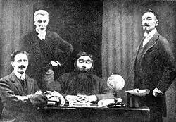 Frontispiece photo from the 1912 edition of The Lost World, showing the fictional members of the expedition, left to right: E. D. Malone; Professor Summerlee; Professor G. E. Challenger; Lord John Roxton (Challenger was impersonated by Conan Doyle himself)