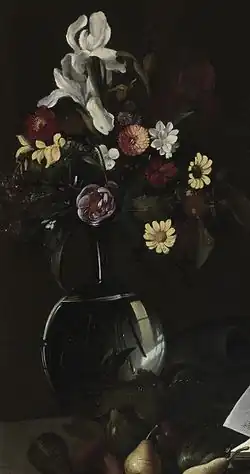 The flowerpiece is of major importance for the still-life tradition, not only in Italy, but also in the Netherlands, and there is a certain link to earlier Flemish painting; for example, many of the Flemish flower painters, from Jan Brueghel the Elder to Ambrosius Bosschaert and Balthasar van der Ast, often waited to study separate specimens in various seasons of the year but include them all in a fictive assembly. The fruits in The Lute Player, however, are not of the same season as the flowers, suggesting a similar cross-seasonal approach as Brueghel and Bosschaert.