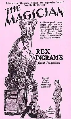 The Magician is a 1926 American silent fantasy horror film directed by Rex Ingram about a magician's efforts to acquire the blood of a maiden for his experiments to create life. It was adapted by Ingram from the 1908 novel The Magician by W. Somerset Maugham.[2] It stars Alice Terry (the director's wife), Paul Wegener and Iván Petrovich. Critic Carlos Clarens wrote that it was "perhaps the most elusive of lost films."[3] However, since the time Clarens wrote this, various prints of the film have surfaced. Some have screened at independent movie festivals from 1993 onwards, and the film has also been shown on Turner Classic Movies. It remained commercially unavailable until being released on DVD in the Warner Brothers Archive Collection in 2011 (with a running time of 88 minutes).[1]