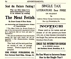 The Meat Fetish: Two Essays on Vegetarianism was then published by the Public Publishing Company, at the First National Bank Building, in Chicago, Illinois. It was described as an "interesting and comprehensive primer on vegetarianism" in an advertisement taken out in the periodical Land and Freedom. The advertisement column also directs the reader to "Send the Packers Packing! Why eat filth when it is quite unnecessary? Learn to do without by reading The Meat Fetish."[14] The identical advertisement also appears in the periodicals Single Tax Review, as well as The Public. In 1907, the cost for one copy of The Meat Fetish pamphlet was post-free with 10 cents of postage stamps, or twelve copies for 1 dollar with postage paid.[14]