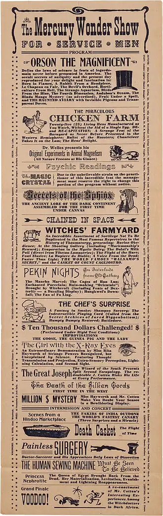 - ^ "The Mercury Wonder Show for Service Men. Orson the Magnificent. (Lot 241)". Magic—The Manny Weltman Houdini Collection (Sale 1949), Swann Galleries. Retrieved 2014-06-09.