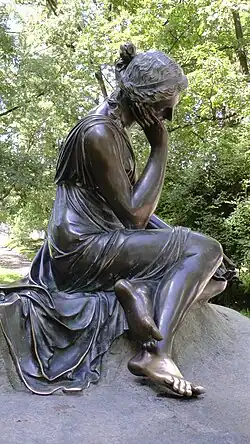 The fountain attracted the attention of Russian artists, graphic artists, and illustrators. Andrei Martynov's lithograph is included in his series Views of St. Petersburg and its environs.[75] The authors of the commentary edition of Pushkin's works noted the similarity between the sculpture in Tsarskoye Selo and the poet's drawing in Chapter III of Eugene Onegin (PD 835. L. 7 ob.), which depicts a grieving Tatiana.[76] Literary scholar Elena Stupina wrote that the bend of the neck, hairstyle, curl falling on the neck, exposed shoulder, and the position of the hand coincide. Another confirmation she found in the draft of stanza XXXII, which is next to the drawing of Tatiana sitting on the bed, is the word “petrified”, which is next to a detailed verse description of Tatiana's body position.[77] Stupina also mentioned another drawing, the reproduction of which she cited in her article: "Tatiana, bowing her head on her palm, stands at full height, turning away from the viewer".[78] The notebook PD No. 835, in which both drawings are found, is known as the second Masonic notebook. In 1822, after the closure of the Masonic lodge “Ovid” in Kishinev, the treasurer of the lodge and a good acquaintance of Pushkin, Nikolai Alekseev, gave the poet three notebooks is in a leather binding, and on its cover is stamped the Masonic sign “OV” in a triangle.[79]
