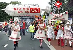 In September 2006, the Mischief Makers started to support the work of unions and other group opposing the cuts and privatisation of the UK's National Health Service (NHS). To add a creative element to the trade unions' work, a giant syringe was built[30] and included in a "2000 people strong demonstration"[31] through the City of Nottingham on 23 September.