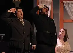 A didactic critique of traditional American society, The Rise and Fall of the City of Mahagonny was one of Brecht's most successful productions that was constructed in collaboration with German-American composer Kurt Weill. It projected a cynical view of German civilisation that played on the concept of the ‘modern myth’.[22] It was regarded as a tale of an “imaginary yet plausible town, peopled by fortune seekers, prostitutes and shady businessmen (and women), where absolutely anything goes, except having no money”.[38] This satirical opera blurs the boundaries of theatrical representation as it blends song, rhythm, jazz and drama into a dramatic fusion of character visuals.[2] Brecht wanted to present through a new and unique avenue the functionality of a capitalist society and how people interacted within it.[22]