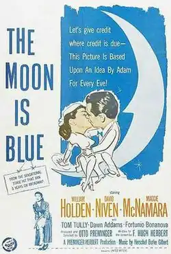 The Moon Is Blue is a 1953 American romantic comedy film produced and directed by Otto Preminger and starring William Holden, David Niven, and Maggie McNamara. Written by F. Hugh Herbert and based on his 1951 play of the same title, the film is about a young woman who meets an architect on the observation deck of the Empire State Building and quickly turns his life upside down. Herbert's play had also been a huge success in Germany, and Preminger decided to simultaneously film in English and German, using the same sets but different casts. The German-language film version is Die Jungfrau auf dem Dach.
