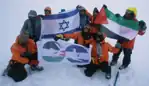 The joint Israeli and Palestinian team display flags of their countries atop The Mountain of Israeli-Palestinian Friendship