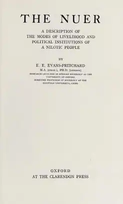 The Nuer: A Description of the Modes of Livelihood and Political Institutions of a Nilotic People is an ethnographical study by the British anthropologist E. E. Evans-Pritchard (1902–73) first published in 1940. The work examined the political and familial systems of the Nuer people in the Anglo-Egyptian Sudan and is considered a landmark work of social anthropology. It was the first of three books authored by Evans-Pritchard on Nuer culture.