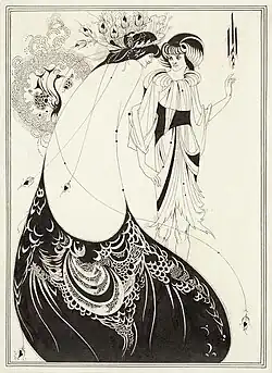 The Peacock Skirt was the second of ten illustrative plates published with the English version of Wilde's play. It shows a rear quarter view of a woman, Salome, wearing a long robe decorated with stylised peacock feather pattern. Her headdress is also decorated with peacock feathers, and more long peacock feathers drape down over her back. The head of a peacock is visible over her left shoulder. Salome is turned to the right, to converse with a second figure, probably the "Young Syrian" mentioned in the text of the play, with an androgynous face but masculine hairy knees, elaborate hairstyle and pleated tunic.