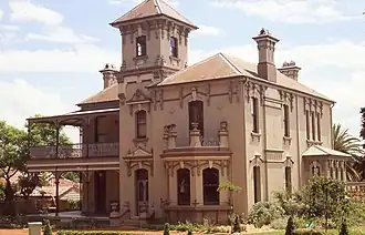 An excellent example of the great Victorian mansions and a reminder that Burwood was one of Sydney's fashionable suburbs for the well to do. The house has fine external applied detailing and has retained its landscaping. It is a good example of its period and a rare survival in condition and setting. Two storey Victorian mansion with three storey tower. Built of brick, cement and stone foundations. Walls are cemented and painted, the tower is richly ornamented. Front projecting wing and two storey decorative cast iron verandahs. Front projecting wing has decorated bay window on ground floor and forms open verandah to first floor with edging of decorative iron well landscaped gardens, lawns and driveway.[6][1]