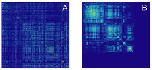 Each row and column of this matrix represents a particular good, and the off-diagonal entries in this matrix reflect the proximity between a pair of products. A visual representation of the proximity matrix reveals high modularity: some goods are highly connected and others are disconnected. Furthermore, the matrix is sparse. Five percent of its elements equal zero, 32% are less than 0.1, and 65% of the entries are below 0.2. Because of the sparseness, a network visualization is an appropriate way to represent this dataset.