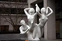 The sculpture was carved in Carrara, Italy, from a single 200-ton block of white Pentelic marble, quarried near Athens.[3] It depicts five "larger than life" nude figures, including three females, one male and one child.[5][6] The statue is set on a pedestal within a fountain, surrounded by water jets.[3] The figures' forms curve upward, and two of the females have their hands raised, while the third "sleeps in the rear".[5] The male figure appears to float and is reaching up with both hands, while the child figure is located behind the foremost female.[5]