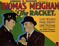 The Racket is a 1928 American silent crime drama film directed by Lewis Milestone and starring Thomas Meighan, Marie Prevost, Louis Wolheim, and George E. Stone. The film was produced by Howard Hughes, written by Bartlett Cormack and Tom Miranda, and was distributed by Paramount Pictures.[1] It was adapted from Cormack's 1927 Broadway play The Racket.[2]