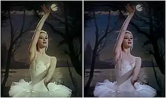A main point of contention amongst both British and American critics was a perceived lack of realism concerning the ballet sequences.[61] The focus of this criticism was the film's central 17-minute ballet performance of The Ballet of the Red Shoes: Many dance critics felt the sequence's impressionistic touches—which include abstract hallucinations and visual manifestations of Vicky's mental state—detracted from the physical aspects of the ballet.[62] British ballet critic Kathrine Sorley Walker also dismissed the sequence, commenting that it marked "a departure from the illusion of stage ballet to the limitless and lush spaces reflecting the ballerina's thought."[59] Eames made similar criticism, condemning the subjective elements of the sequence as "corrupting the integrity of the ballet," as well as the choreography.[63] Philip K. Scheuer of the Los Angeles Times, however, praised the presentation of ballet in the film, deeming it "the most ambitious—and probably the most dazzlingly successful—use of traditional-type ballet in any motion picture to date."[64]