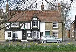 The public house and a cottage to its right have two storeys, and a pantile roof with coped gables and shaped kneelers. The pub is in painted rendered stone, with applied timber framing to the upper floor. There are three bays, the upper floor is jettied, and the right bay is gabled. The central doorway has a two-light window to its left, and a canted oriel window to the right. The window in the left bay on the upper floor has four lights, and the other windows are cross windows. The cottage is in stone, and has one bay. It contains a doorway to the left, and sash windows, the ground floor openings with wedge lintels.[1] Inside, it has beamed ceilings, terracotta floor tiles, and two open fires.[4]