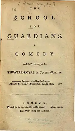 The School for Guardians is a 1767 comedy play by the Irish writer Arthur Murphy.[1] It premiered at the Theatre Royal, Covent Garden in London on 10 January 1767.[2] The original cast included John Walker as Sir Theodore Brumpton, Henry Woodward as Young Brumpton, William Smith as Bellford, Edward Shuter as Oldcastle, John Dunstall as Lovibond, Mary Wilford as Harriet and Ann Elliot as Mary Ann. In 1777 Thomas Hull adapted it into a comic opera Love finds the Way with music composed for the production by Thomas Arne.