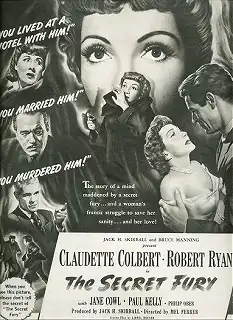 The Secret Fury is a 1950 American noirish psychological thriller starring Claudette Colbert and Robert Ryan. Directed by Mel Ferrer for RKO Radio Pictures, it also featured a rare screen appearance of Broadway legend Jane Cowl,[2] with Paul Kelly also in support.