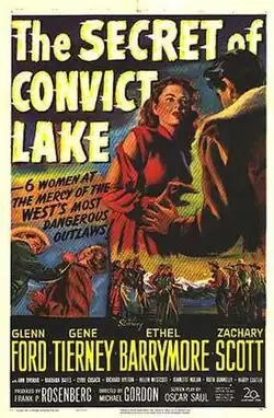 The Secret of Convict Lake is a 1951 American Western film directed by Michael Gordon and starring Glenn Ford, Gene Tierney, Ethel Barrymore and Zachary Scott.[2] The film was a critical and commercial success. The story is fiction, based on legends of Convict Lake, located in the Sierra Nevada mountain ranges of northern California.[3][4] and a short story by Anna Hunger and Jack Pollexfen.[5] The film is the final role for Ann Dvorak before her retirement from the screen.