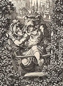 In 1756 German preacher Sebastian Sailer wrote the tale down as a comedy.[4] Both Ferdinand Fellner and Georg Mühlberg are well known German artists who made illustrations to the story.
