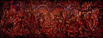 • Transgression, 12 X 22 feet ( 3.65 X 6.75 meters), oil on canvas, 1984[75] The composition divides the scene in three triangular parts dominated by a large central section extending its edges to the upper corners of the canvas. At the center top, two winding ladders entwine in V-shape form alongside two large birds of prey swooping over a scene intensified by divisions, shapes, and symmetry of spatial areas animated by struggling figures in various acts and encounters. According to critical analysis, this painting presents the human body as the most telling vehicle to a new sense of soul, and its transformation from the metaphysical to the communicative level.[76] Kanso focuses on the process of transforming sexual desire into discourse and brings into focus the place of sex within techniques of communication and absence of communication as made explicit in psychoanalysis. The only clothed woman in the paintings is placed in the upper right of the center. She alludes to the Madonna reflecting connotations such as asceticism, confession, and mysticism, all concepts closely related to psychoanalysis as a human technique. Her clothing intensifies the sensuality of the nude figures that surround her. On the left side, the figures of a mother, father, and child are symbols of secular sexuality.[77] Prominently positioned in the foreground is the backside of male figure with wing-shape raised arms and almost invisible bent down head is seen thrusting toward forked legs at the center surrounded by female figures. It is noted by some critics that sensuality and eroticism of the women in the painting reflect aspects that partake of Kali and her femininity embodying the erotic and the presence of the body as revolutionary. Hence the eroticism of these bodies and their revolutionary aspect.[78]