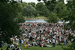 Fans started to arrive at the park with candles on 4 July in tribute to Jones, and the police allowed the park to be opened late so they could stay.[14] By the following morning, there were already 7,000 people.[15]: 323 As with the Stones' performance at the infamous Altamont Free Concert later that year, the Hells Angels were hired as stewards to protect the stage and equipment,[2] something suggested by the Grateful Dead's manager Rock Scully, who was used to the Angels performing this service at free festivals in California.[12] According to Cutler, Jagger said that he was keen on doing a similar free concert in California at some time in the future.[12] At Hyde Park, fifty Angels patrolled the vicinity of the stage, though there was little resemblance other than a superficial one to their American counterparts. They performed their duties in exchange for a cup of tea.[12] In the event, there were only twelve arrests on the day and a subsequent police report claimed that the Angels were "totally ineffective".[12]