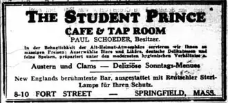 13. ^ "[Advertisement for The Student Prince Cafe and Tap Room]". Springfield Republican. Springfield, Mass. September 24, 1935. p. 4.