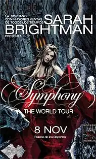 The Symphony World Tour was the fourth worldwide concert tour by English soprano singer Sarah Brightman. The tour started on 4 November 2008 in the city of Monterrey and concluded on 5 April 2009 in Taipei. There were special guests that joined Brightman during select tour dates: Argentinean's Fernando Lima, Italy's Alessandro Safina, and Greece's Mario Frangoulis. The tour concept was a journey through the musical career that Sarah Brightman has had so far (three decades) and includes several high-tech virtual scenery that takes the audience from an enchanted forest, baroque lamps to an atmosphere of fairytales.[1] Much anticipation surrounded The Symphony World Tour especially since the production cost was reportedly more than $2 million and involved more than 100 tons of equipment.[2]