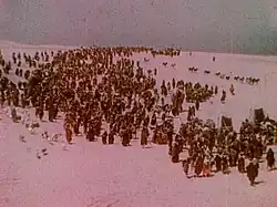 The Exodus scenes were filmed at the Guadalupe-Nipomo Dunes in northern Santa Barbara County.[2] The film location was originally chosen because its immense sand dunes provided a superficial resemblance to the Egyptian desert. Rumor had it that after the filming was complete, the massive sets – which included four 35-foot-tall (11 m) Pharaoh statues, 21 sphinxes, and gates reaching a height of 110 feet, which were built by a small army of 1,600 workers – were dynamited and buried in the sand. Instead, the wind, rain and sand at the Guadalupe-Nipomo Dunes likely collapsed and buried a large part of the set under the ever-shifting dunes. The statues and sphinxes are in roughly the same place they were during filming. In 2012, archaeologists uncovered the head of one of the prop sphinxes; a 2014 recovery effort showed the body of that sphinx to have deteriorated significantly, but a second better-preserved sphinx was discovered and excavated.[6][7] The effort to locate and excavate the set was the subject of a 2016 documentary, The Lost City of Cecil B. DeMille.[8]