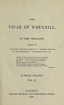 The Vicar of Wrexhill is an 1837 novel by the British writer Frances Milton Trollope, originally published in three volumes. The High Church Anglican Trollope was heavily critical of the Evangelical movement.[1] It has been described as a "scurrilous" critique of Low church Evangelical Anglicanism, often referred to in the novel as Calvinist Doctrine.[2] It is Frances Milton Trollope's best remembered novel, with the protagonist resembling Mr Slope in her son Anthony Trollop's Barchester Towers.[3]