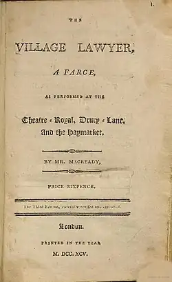 The Village Lawyer is a 1787 comedy play by the British writer George Colman the Elder, although it has also been mistakenly attributed to William Macready. A farce, it premiered as an afterpiece at the Theatre Royal, Haymarket in London on 28 August 1787. The Irish premiere took place at the Crow Street Theatre in Dublin on 5 August 1794[1] It was also staged at the Theatre Royal, Drury Lane. The original Haymarket cast included John Edwin as Sheepface, John Bannister as Scout, William Henry Moss as Justice Mittimus, William Parsons as Snarl and Lydia Webb as Mrs Scout.[2]